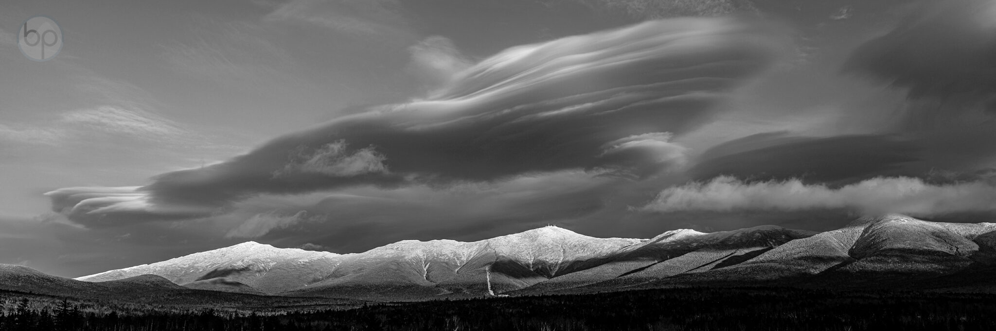 This is a black and white view of the west side of Mount Washington and the Presidential Range in New Hampshire. Prominent lenticular clouds are seen above the mountains. From the Mount Washington Observatory:
